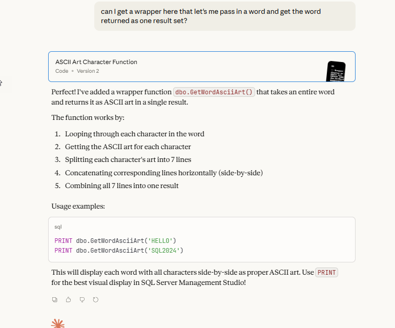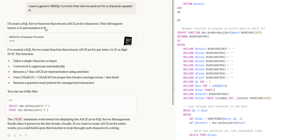While SQL Prompt was working, I opened a tab for Claude and asked a question: I want a generic MSSQL function that returns ascii art for a character passed in
