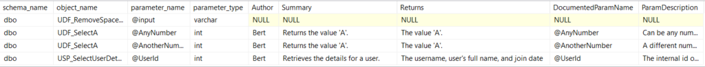d.parameter_orderThis query pulls the parameters of our procedures and functions from sys.parameters and joins them with what we documented in our XML documentation. This gives us some nicely formatted documentation as well as visibility into what objects haven’t been documented yet: