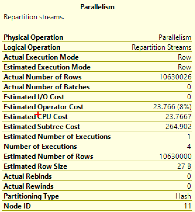 We see that we pulled back over 10.5 Million rows, We see the Partitioning Type is Hash, and that our estimated subtree cost was high enough for us to get a parallel plan. The trick is to hit F4 while you have selected to get even more information.