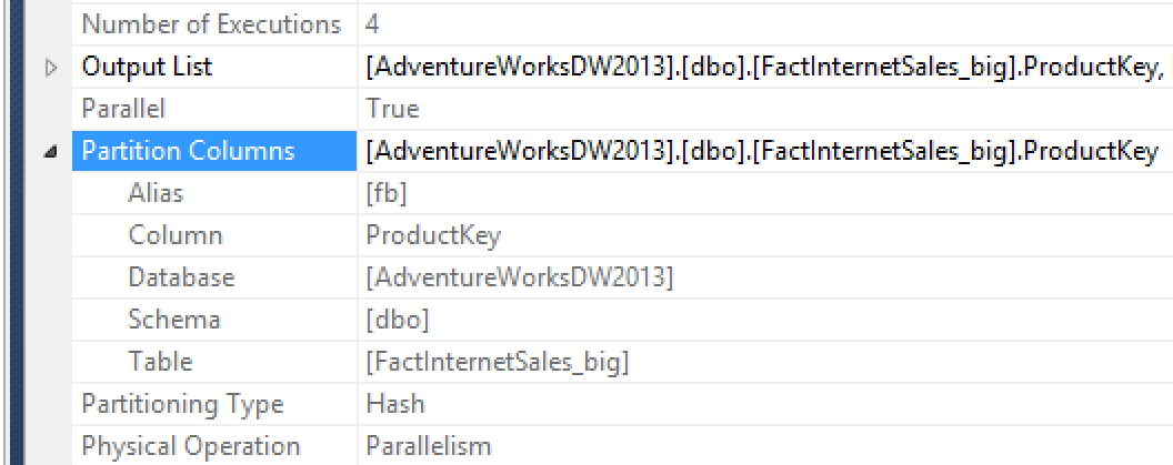 We can see there was a skew, based on the hash. Looking further down at our properties we can see that this was a hash partition, confirmed from our graphical portion of the plan, but we can see the hash key was on the ProductKey column. This was done as we were gathering data to prepare for our join.