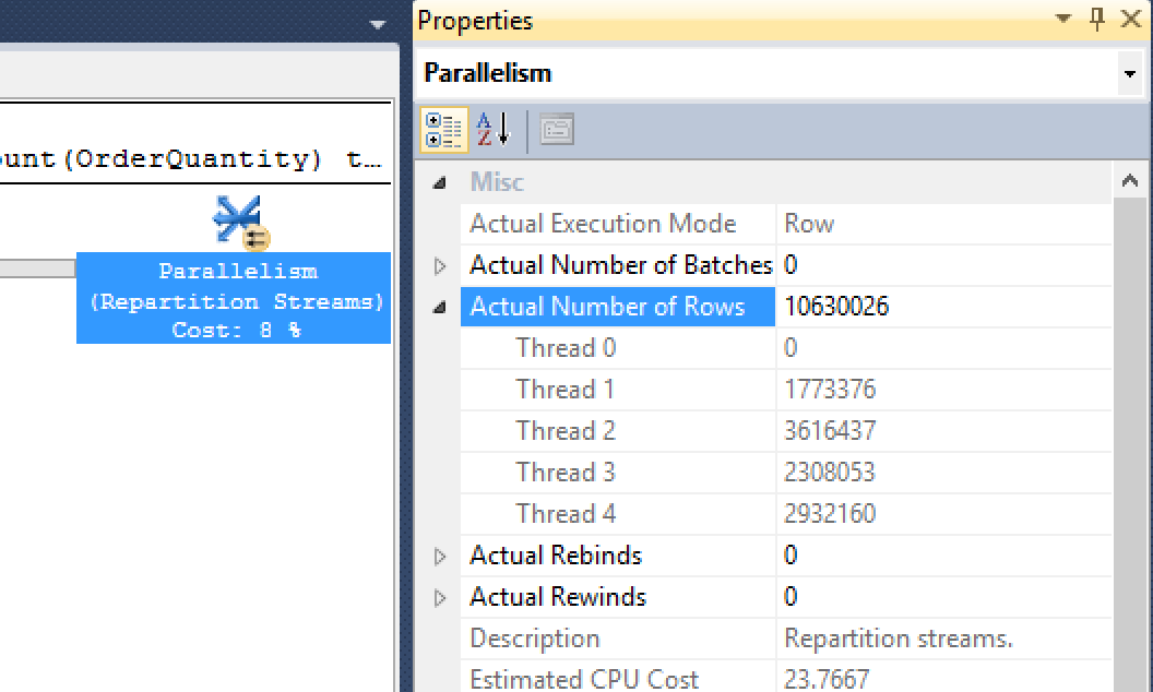 By expanding the Actual Number of Rows we can see that this was somewhat evenly distributed. Thread 0 is our control Thread so it should be sitting at 0 rows. Thread 1 had only 1.7 million rows, Thread 2 had 3.6 Million, Thread 3 had 2.3 million, and Thread 4 had 2.9 million.
