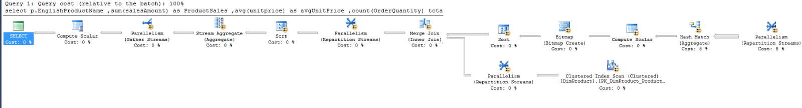 set statistics profile on ,sum(salesAmount) as ProductSales ,avg(unitprice) as avgUnitPrice ,count(OrderQuantity) totalProductsSold dbo.factinternetsales_big fb inner join dbo.dimproduct p on fb.ProductKey=p.ProductKey group by p.EnglishProductName The goal here is to select enough data that SQL Server will produce a plan that will push the cost to a parallel plan, and in doing so will read in data using multiple threads. In this case we will get two repartition streams operators in our statements. Let’s start off looking at the query plan. We’ll also get the output of the set statistics profile on, but we’ll cover that in a minute.