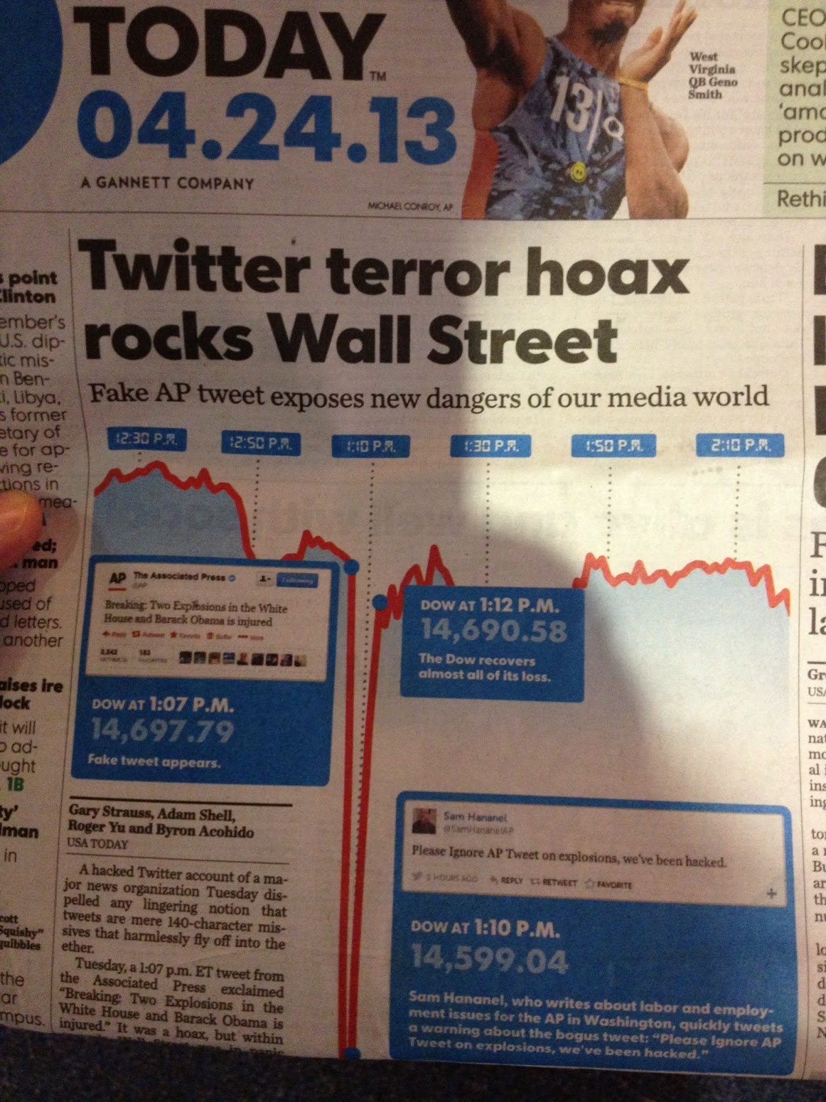 I was a little busy yesterday with work. Like most days I poked my head out on Twitter and checked several new sites. I even received some push updates to my phone via USA Today, Fox News, and the New York Times. So Imagine my surprise when this morning while standing in line at the Starbucks in the Charlotte airport that I see this. Twitter Terror Hoax Rocks Wall Street, AARRRUUUU?