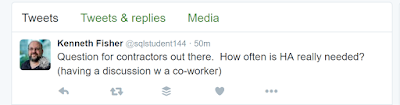 Asked for further explanation Kenneth didn’t need HA at his environment, more on this in a moment, he was looking for a rounded point of view.  I had a couple replies and then started direct messaging, DM`ing, Kenneth to share my insight.  This is a conversation you must have with the business.