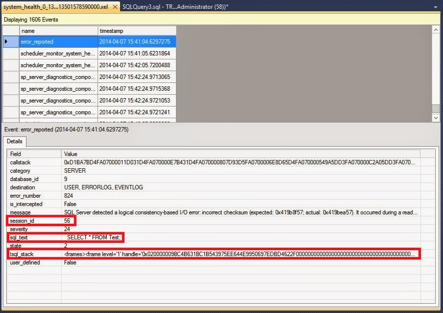 To view the captured event session data, we can either right click on the session and click “watch live data” or we can open the event file which is located in the Log folder under the install directory of the instance. The event_file target will always append _0_ and then some long number the end of each file name. The _0_ has no significance, but the number following it is the number of milliseconds since January 1, 1600. This is done to help guarantees filename uniqueness. Once you have opened the file, scroll down to the timestamp of the error and you should see an event called error_reported. Select that event and then you’ll see the event details in the lower window.