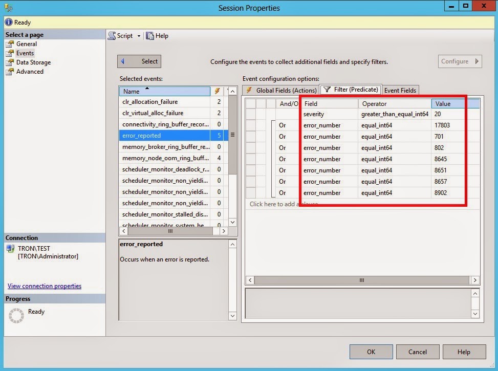 On the filter tab, you’ll see each of the predicates that are defined. This event will fire for error numbers: 17803, 701, 802, 8645, 8651, 8657 and 8902, as well as for any severity greater than or equal to 20. Most of these errors are related to out of memory issues, but the severity 20+ errors are all critical system issues.