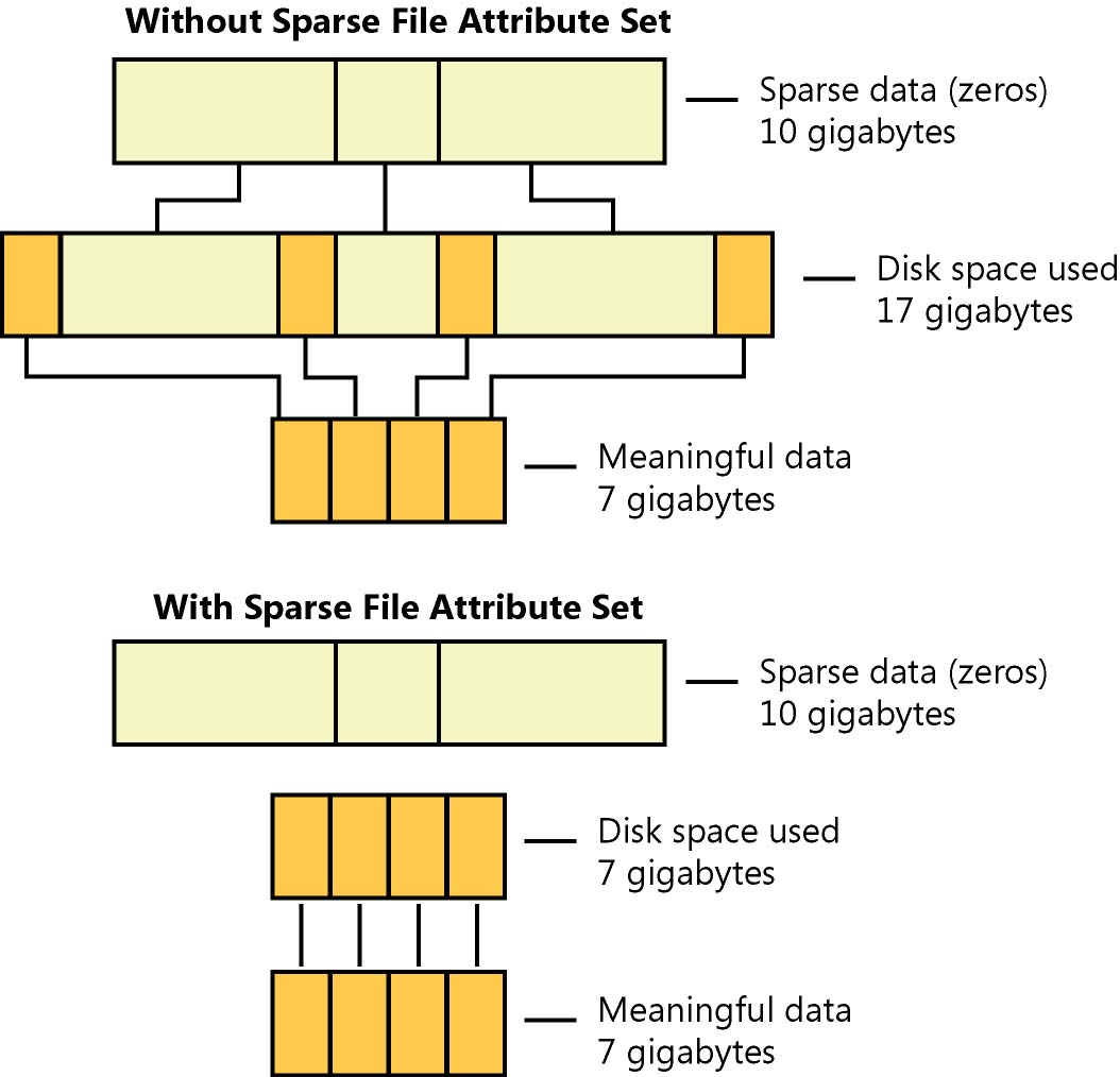 A sparse file only uses the physical space required to hold the actual ("meaningful") data. As seen in this diagram from Technet, in this example a regular/non-sparse file would be 17GB while a comparable sparse file would only be 7GB.