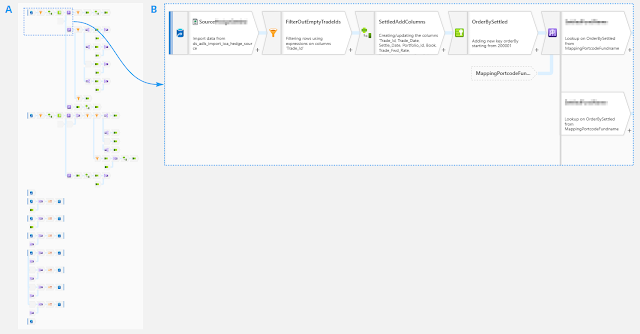 Exhibit A shows a simple data flow where two sourcing files are getting transformed into 7 output files with the help of a series of merging transformations. If I want to make further updates to this data flow and open it in my data factory, then I will always get see it in a “zoomed to fit” fashion. It then takes a few manual “zoom in” operations to get a close look at a particular region (Exhibit B). When I try to update the code or script of my data flow and save it, I get back zoomed out to the original “refreshed” look, and then I have to repeat my “zoom in” operations again. This is not very user friendly at all and it needs some improvement too. I would really like to see some enhancements in preserving a previous zoom state when I open the very same data flow again.