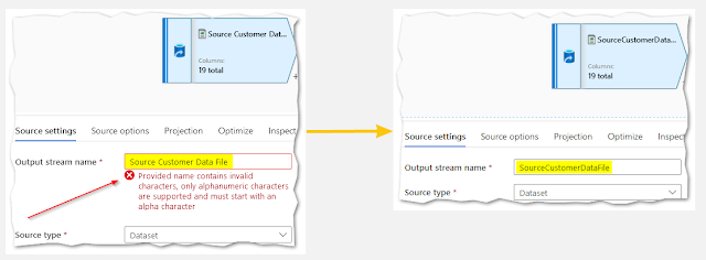 Currently, in ADF data flows you’re not allowed to have space (‘ ‘) characters in the naming of your transformation steps along with sources & sinks. And it’s not very convenient to always rely on Capitalizing Each Word and then combine them together into one construction (“CapitalizingEachWord”), not user friendly at all and it needs some improvement.