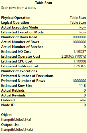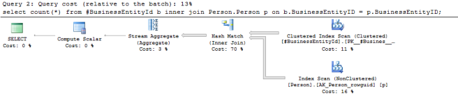 CREATE TABLE #BusinessEntityId (BusinessEntityID INT NOT NULL PRIMARY KEY CLUSTERED); INSERT INTO #BusinessEntityId SELECT BusinessEntityID FROM Person.Person; SET STATISTICS IO ON; SET STATISTICS TIME ON; SELECT COUNT(*) FROM #BusinessEntityId b INNER JOIN Person.Person p ON b.BusinessEntityID = p.BusinessEntityID; SET STATISTICS IO OFF; SET STATISTICS TIME OFF; DROP TABLE #BusinessEntityId;