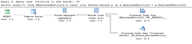 DECLARE @BusinessEntityId TABLE (BusinessEntityID INT NOT NULL PRIMARY KEY CLUSTERED); INSERT INTO @BusinessEntityId SELECT BusinessEntityID FROM Person.Person; SET STATISTICS IO ON; SET STATISTICS TIME ON; SELECT COUNT(*) FROM @BusinessEntityId b INNER JOIN Person.Person p ON b.BusinessEntityID = p.BusinessEntityID; SET STATISTICS IO OFF; SET STATISTICS TIME OFF;