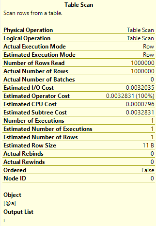 Look at where it says “Number of Rows Read” and “Actual Number of Rows” and you’ll see 1,000,000. Then look down to the Estimated Number of Rows and you’ll see 1. That’s quite a big difference.