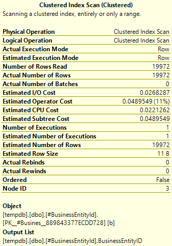 Table ‘#BusinessEntityId___________________________________________________________________________________________________00000000013D’. Scan count 1, logical reads 35, physical reads 0, read-ahead reads 0, lob logical reads 0, lob physical reads 0, lob read-ahead reads 0.