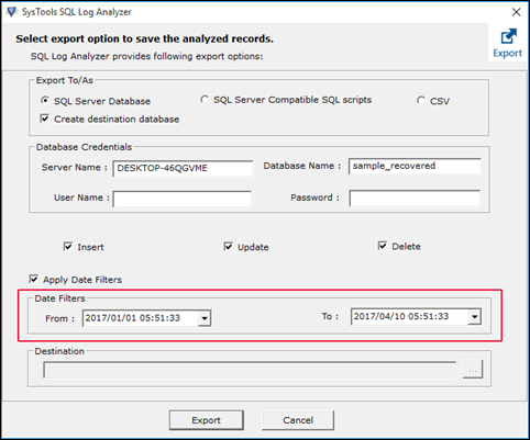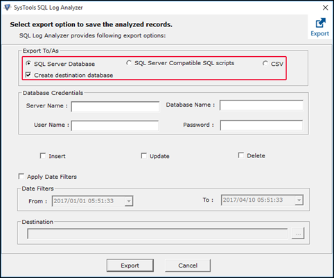 - Export Selective Tables From Browsed File : Instead of exporting entire records, SQL Log file viewer provides feature to export desired Server tables, based upon certain time duration or date-range. In addition to this, one can check/uncheck tables, which they want/do not want to export in SQL Server database, or save in SQL script/CSV file format. Moreover, an option is provided to save complete export details in CSV format for future reference.