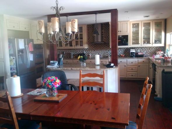 Here’s our kitchen she designed. The kitchen used to be where the dining room table is now and the current location of the kitchen was a spare bedroom. So this is a brand new kitchen and it was built on a budget. Somewhere between $5-10k in material costs (closer to the $5k I believe). Which if you have ever built a kitchen before is insanely cheep.