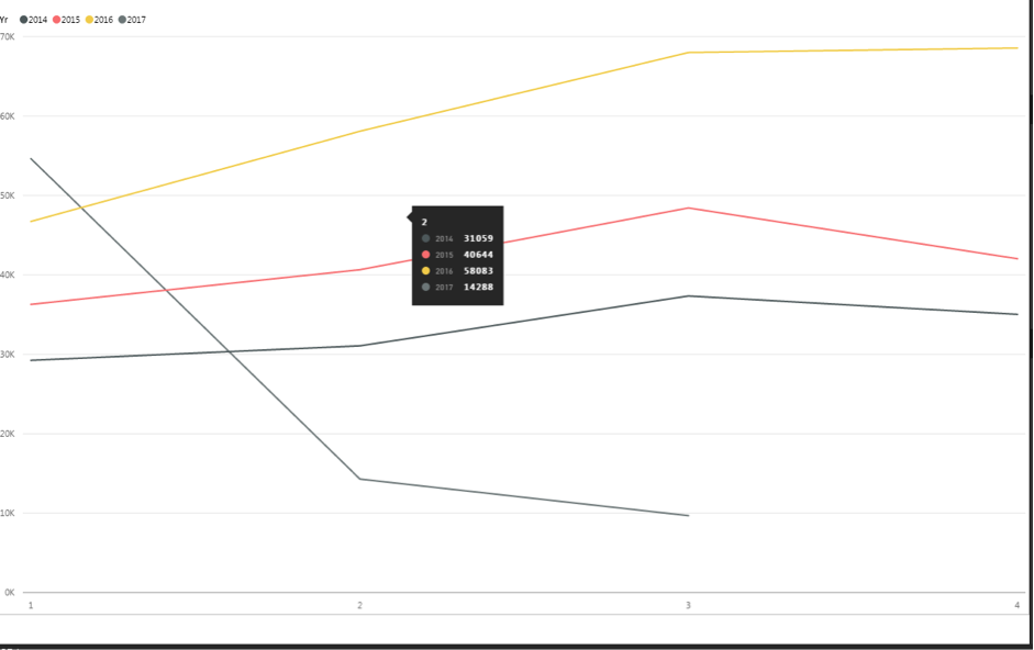 I imported the query into Power BI and filtered on years and months to the first three months of each year for the last four years. I got the following graph