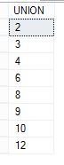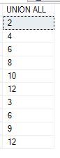 --Table setup CREATE TABLE UnionTable1 (Id Int) CREATE TABLE UnionTable2 (Id Int) INSERT INTO UnionTable1 VALUES (2), (4), (6), (8), (10), (12) INSERT INTO UnionTable2 VALUES (3), (6), (9), (12)