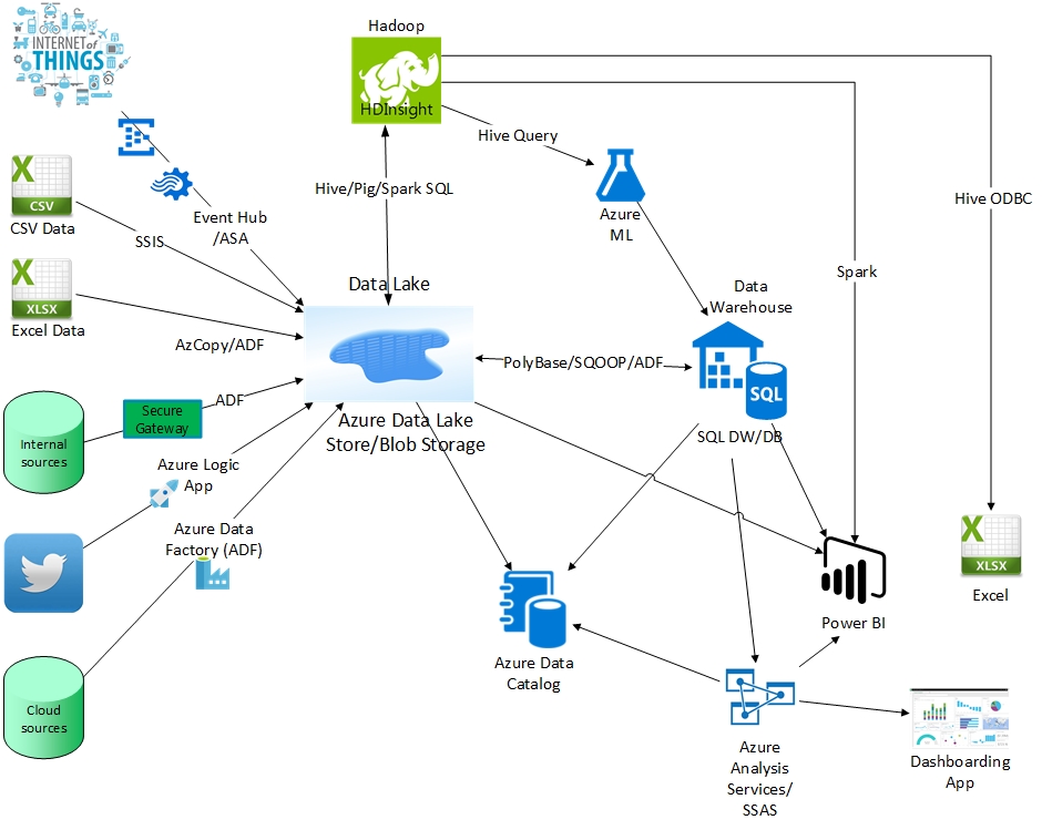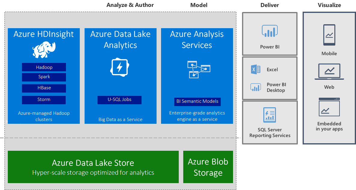 You will also need to determine if you solution will have batch and/or interactive queries. All the products support batch queries, but ADLA does not support interactive queries (so you could not use the combination of Power BI and ADLA). If you want to stay within the Hadoop world you can use the HDInsight cluster types of Spark on HDInsight or HDInsight Interactive Query (Hive LLAP) for interactive queries against ADLS or Blob Storage (see General availability of HDInsight Interactive Query – blazing fast queries on hyper-scale data) and can use AtScale instead of AAS to build cubes/OLAP within Hadoop. AtScale will work against data in ADLS and Blob Storage via HDInsight.