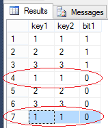 In the below example, we have a compound natural key of the two fields key1 and key2. The field bit1 is not a member of the natural key, but does inform us as to some table usage. Perhaps bit1 indicates that this record is Active (1) or Inactive (0), or whether the data is Confirmed (1) or Unconfirmed (0), or Deleted (0) or Not Deleted (1).