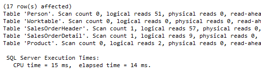 SET STATISTICS TIME ON<br>SET STATISTICS IO ON<br><br>SELECT Person.LastName, Person.FirstName<br>FROM Person.Person<br>WHERE Person.BusinessEntityID IN<br> (<br> SELECT SalesOrderHeader.SalesPersonID<br> FROM Sales.SalesOrderHeader<br> INNER JOIN Sales.SalesOrderDetail<br> ON SalesOrderHeader.SalesOrderID = SalesOrderDetail.SalesOrderID<br> INNER JOIN Production.Product<br> ON SalesOrderDetail.ProductID = Product.ProductID<br> WHERE Product.Name = 'Sport-100 Helmet, Red'<br> );<br>