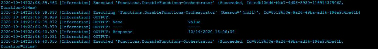 The current Activity function now performs some processing by taking the timezone element from the incoming @Request parameter and then generating the @response with the output of UTC converted time to a requested timezone. Again, this wasn't a real project use case of my Azure Function that caused me to write this blog post, I'm just using this proof-of-concept code to show what can be done, the rest of the Azure Function/Durable Function coding is up to us to explore.