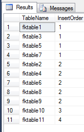 with cteFK (pktable, fktable) as ( select pktable = o1.name , fktable = isnull(o2.name, '') from sysobjects o1 left join sysforeignkeys fk on o1.id = fk.fkeyid left join sysobjects o2 on o2.id = fk.rkeyid where o1.xtype = 'u' and o1.name not in ('dtproperties','sysdiagrams') group by o1.name, isnull(o2.name, '') ), cteRec (tablename, fkcount) as ( select tablename = pktable , fkcount = 0 from cteFK UNION ALL select tablename = pktable , fkcount = 1 from cteFK cross apply cteRec where cteFK.fktable = cteRec.tablename ) select TableName , InsertOrder = dense_rank() OVER ( ORDER BY max(fkcount) asc ) from ( select tablename = fktable , fkcount = 0 from cteFK group by fktable UNION ALL select tablename = tablename, fkcount = sum(ISNULL(fkcount,0)) from cteRec group by tablename ) x where x.tablename <> '' group by tablename order by 2,1 asc