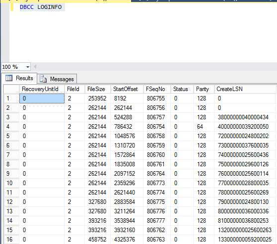 The query will return a result set of all LSNs created for that database, the COUNT of those rows is the amount of VLFs you have.
