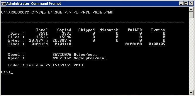 ROBOCOPY C:\SQL E:\SQL *.* /E /NFL /NDL /NJH