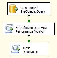 The first component hooks up to your local instance's master database, fetching a cross-joined resultset from sysobjects. (It's the volume of rows that matter here - not the content.) The second component is one of my Data Flow wiretap scripts that will dump timing information to the logging stream that we'll be able to watch in the Output window. The last component is a script destination. Normally, I'd just use a Union All or Derived Column to cap the flow, but those result in a lot of "unused column" warnings that would clutter up the logging stream.
