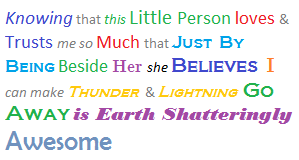 When the baby has a nightmare, or there is thunder outside she clings to me. 99.99% of the time she wants Mom. But when she is scared she wants Dad. It's a little thing I know. But it makes me happy to be there for her. I'm not a jerk I'm not happy that she is scared, but knowing that this little person loves and trusts me so much that just by being beside her she believes I can make thunder and lightning go away is earth shatteringly awesome. Being a Dad means that you are more powerful that lightning, able to scare away a monster in a closet just by being awake, and able to bring comfort just by being there. My kids will not be little forever and the baby won't be a baby much longer.