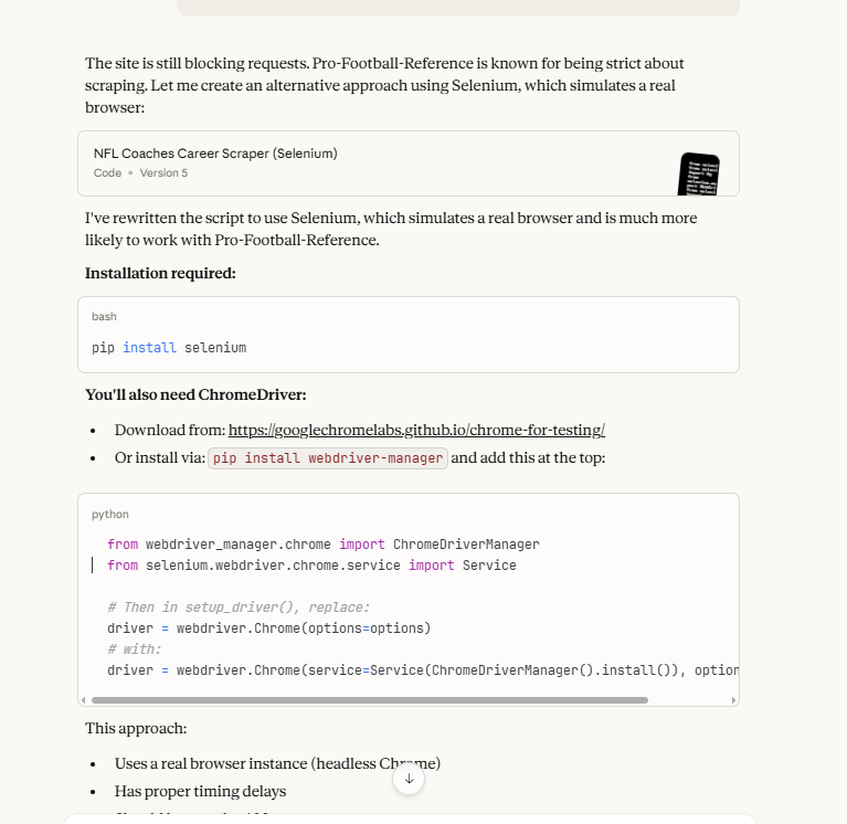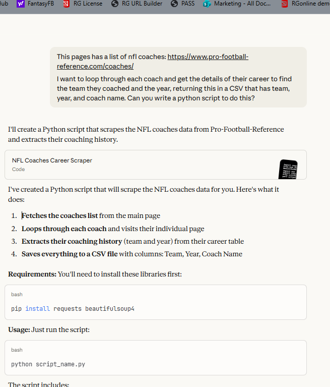 I decided to see if Claude could help get some data. I started with a query: This pages has a list of nfl coaches: https://www.pro-football-reference.com/coaches/