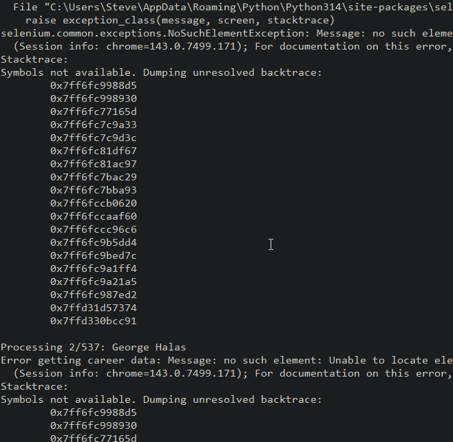 This kind of worked. I got a script, and it ran, but there were some errors. PFR doesn’t like scrapers and they want to protect their data. I get it.