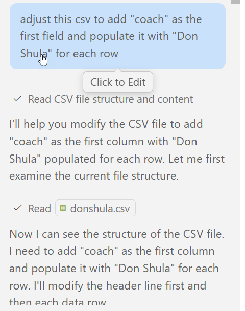 The next day I decided to give in and just grab data from some coaches that I know have won Super Bowls and had success early in their careers (sorry, Andy Reid). I went to each page and clicked the “CSV export” item and then copy/pasted the data into a file. I then asked the Copilot AI for help. Each set of data was nice, and the file was named for the coach, but the coach’s name wasn’t in there. So I let Copilot edit it.