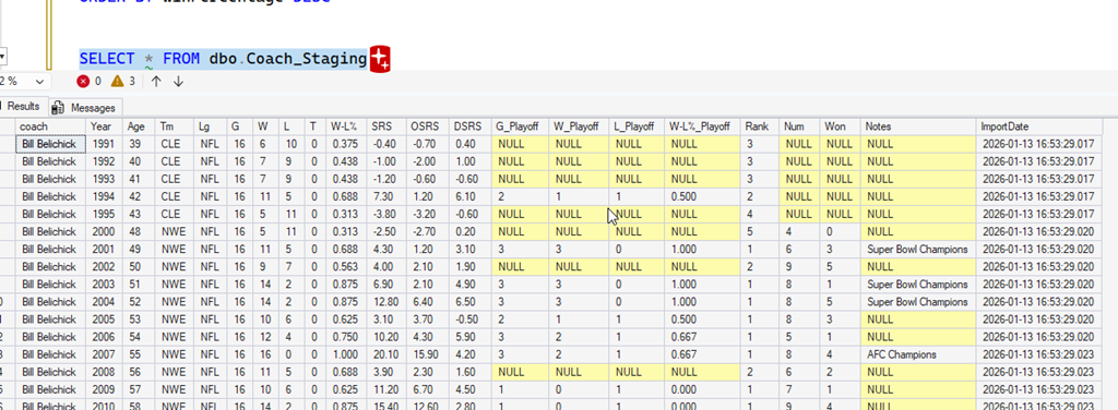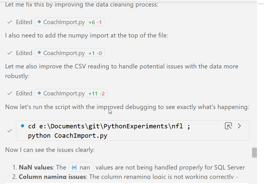 It did, and I saved it (coachimport.py). I ran this, but it errored out. Since this was a file in my repo, I moved back to Copilot, which has access to the files. I asked it to fix the errors. This was the prompt (everything after the colon was pasted in) : I am getting this error in the script: Error importing rawdataNickSirianni.csv: (‘42000’, ‘[42000] [Microsoft][ODBC Driver 17 for SQL Server][SQL Server]The incoming tabular data stream (TDS) remote procedure call (RPC) protocol stream is incorrect. Parameter 24 (“”): The supplied value is not a valid instance of data type float. Check the source data for invalid values. An example of an invalid value is data of numeric type with scale greater than precision. (8023) (SQLExecDirectW)’)