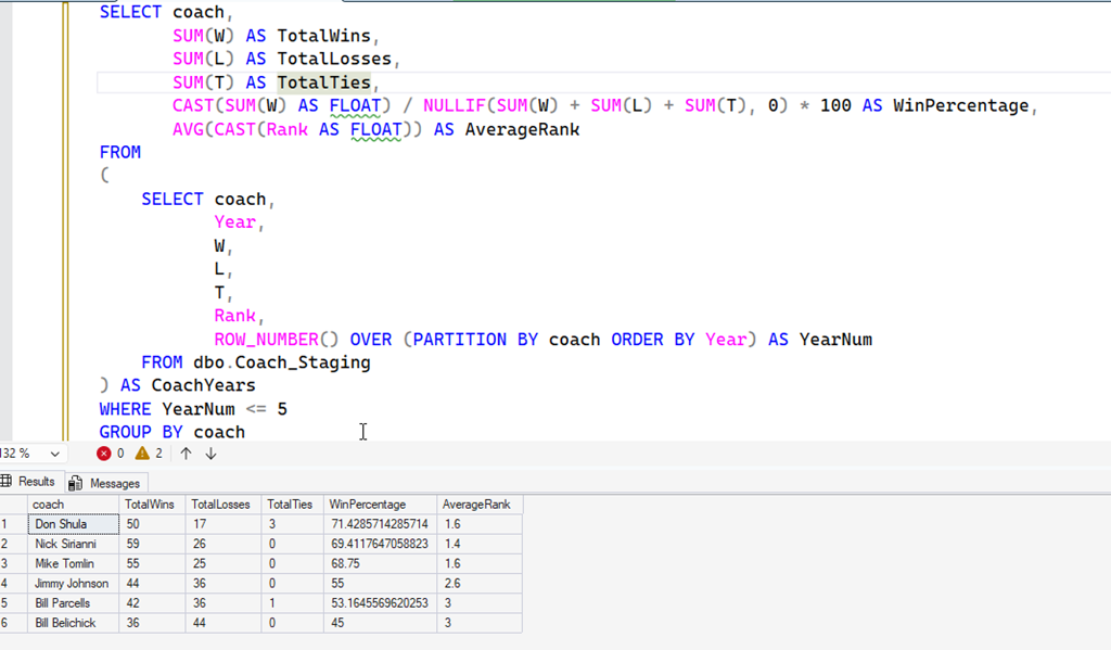 I was listening to the radio the other day and the hosts were discussing the NFL playoffs in 2026. Someone mentioned the winningest coach was Nick Sirianni of the Philadelphia Eagles and no one wanted to face the Eagles. I was wondering if the first part of that was true. I used Claude and SQL Prompt AI to help.