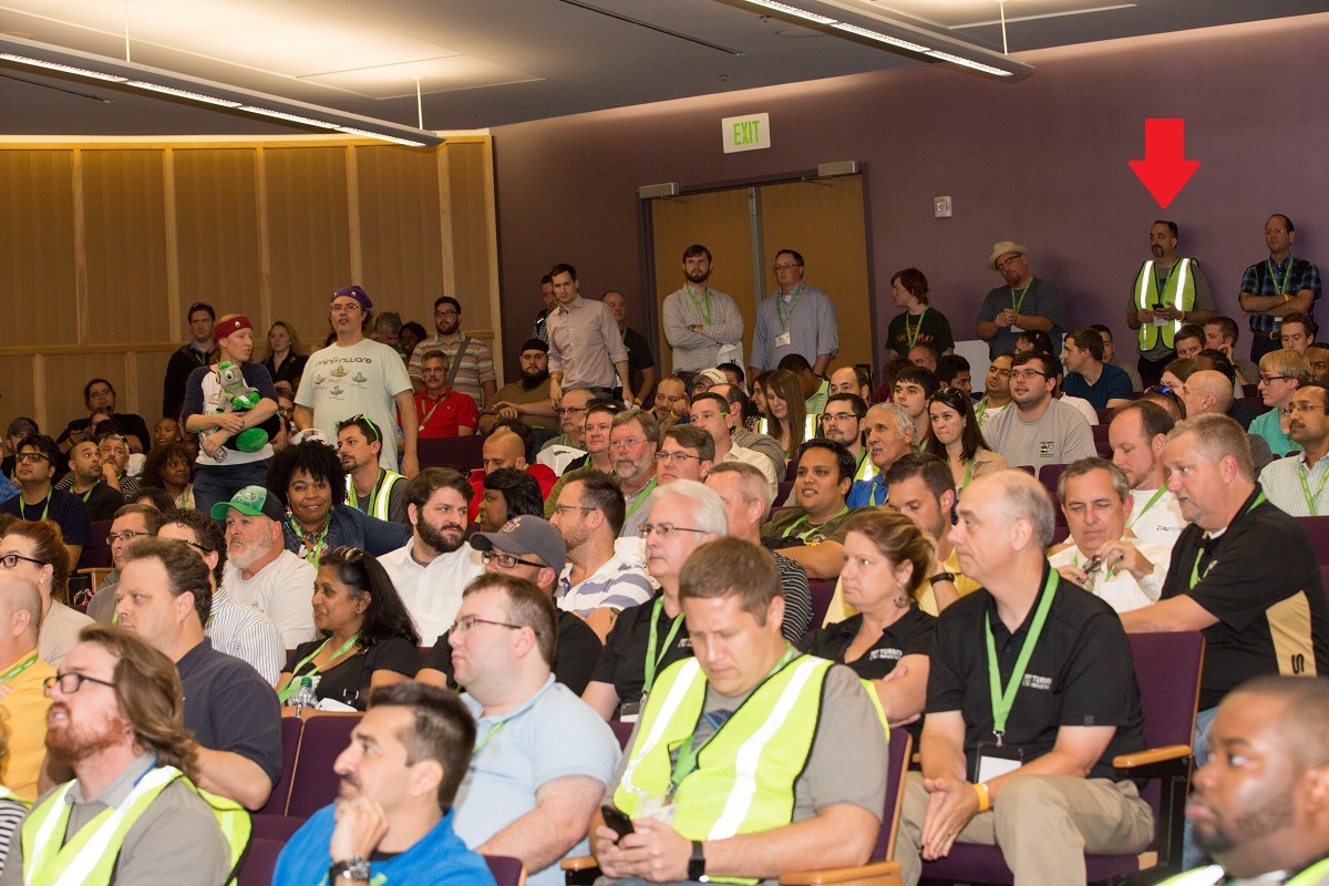 John Wells (arrow) in his volunteer vest at SQLSaturday Baton Rouge 2016 |