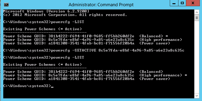 We can see that Balanced is currently select, as this is the default out of the box configuration. So let’s change this. Make note of the GUID above because you’re going to need it. The command is powercfg –SETACTIVE <guidoftheplanyouwant>.