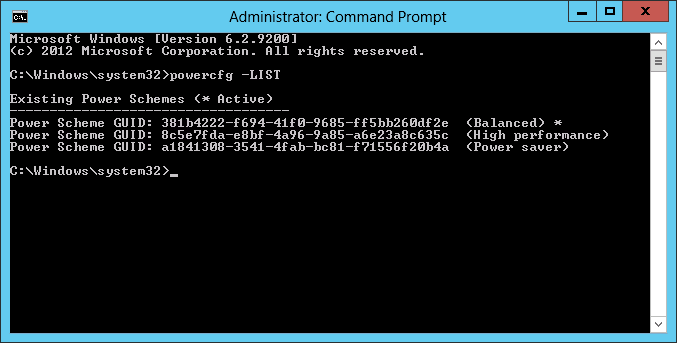 Now in our Command Prompt type powercfg –LIST to see all of the active plans. Your currently selected plan will be denoted with an *.