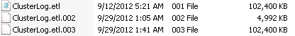 Each time the server is rebooted, a new file will be generated like clusterlog.etl.002 and start logging in that until the server is rebooted again. Up to 3 log files are kept, so after the third  consecutive reboot, you will start loosing old log entries. Please find below a snapshot of etl file in the folder.