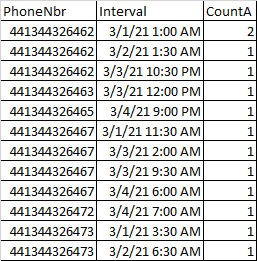 SELECT T2.PhoneNbr, T2.Interval, NULL AS CountA, T2.CountB
