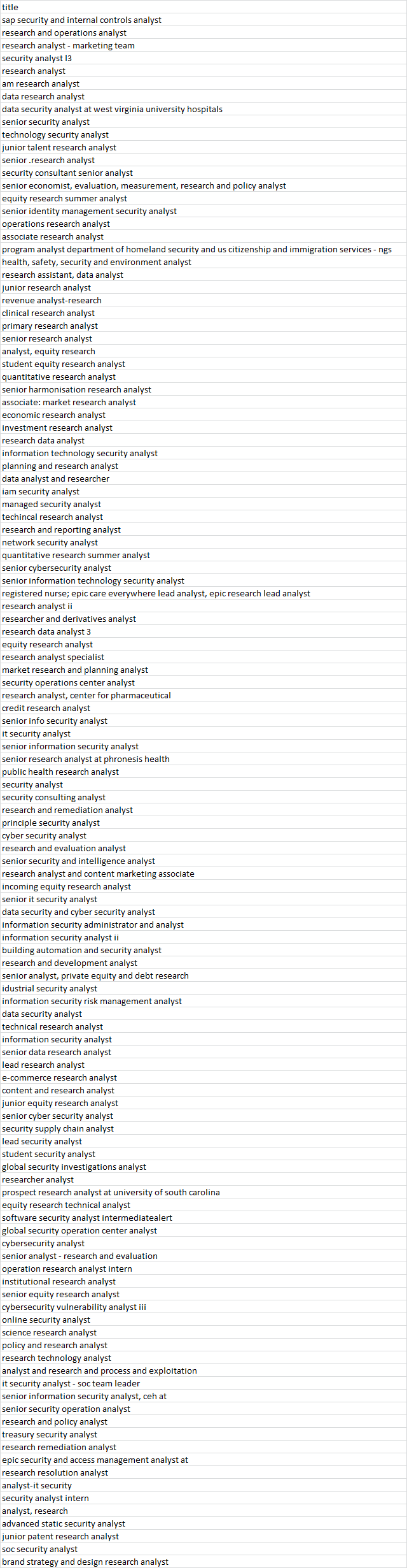To me, it seems that there are two 2 word titles there... Research Analyst and Operations Analyst your original data is fraught with such things.