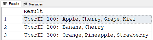 STUFF((--Aggregate the fruit names for each UserID