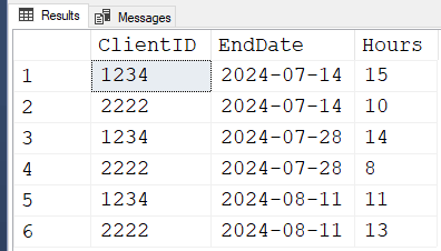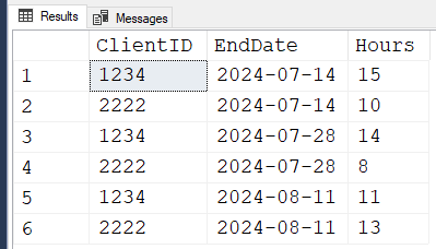 We see groups of rows that you'd already sorted by two week periods by client. Your request boiled down to returning the ClientID, the MAX EndDate, and the SUM of the hours for each 2 week group. The trick is to identify some Group Numbers (Grp) so that we can do the aggregations for each Grp for each ClientID.
