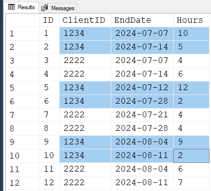 CREATE TABLE #Client( ID int, ClientID int, EndDate Date, Hours int);