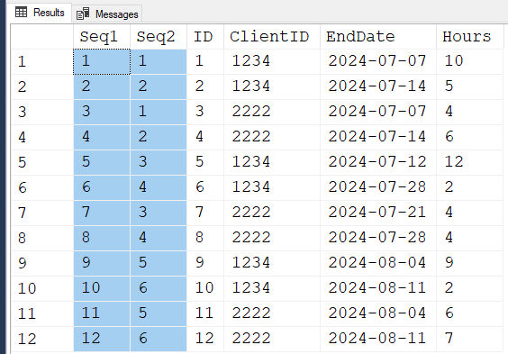 The answer is that we have two sequences now. 1 that starts at 1 and continues to increment for all the rows (Seq1). Although it's hard to tell, the other sequence (Seq2) is also an ever increasing number but it starts at 1 for each ClientID.