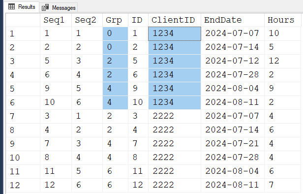 Here's the result sorted so that you can see how the subtraction of Seq1-Seq2 formed the "Grp" numbers for each ClientID. (I used the original formula for the long ROW_NUMBER() form for each of the 2 sequences). Notice that ClientID 1234 has Grp's of 0, 2, and 4 and ClientID has it's own groups of 2, 4, and 6. That's perfect for a GROUP BY Grp and ClientID for our MAX(EndDate) and our SUM(Hours). And, take a look at how the two increasing sequences work out a group number by subtracting Seq2 from Seq1, which are both ever increasing and create the same group numbers for the pairs of weeks.
