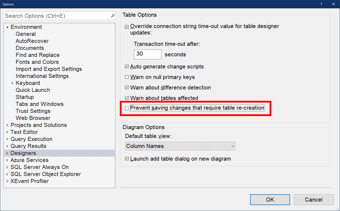 To get to the setting in SSMS, select <tools><options> and then the <Designer> in the window that pops up. See the setting that I put a Red box around and make sure to uncheck the related box.