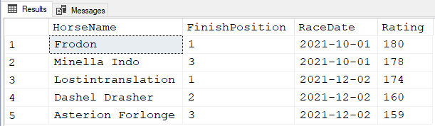 SELECT HorseName,FinishPosition,RaceDate,Rating