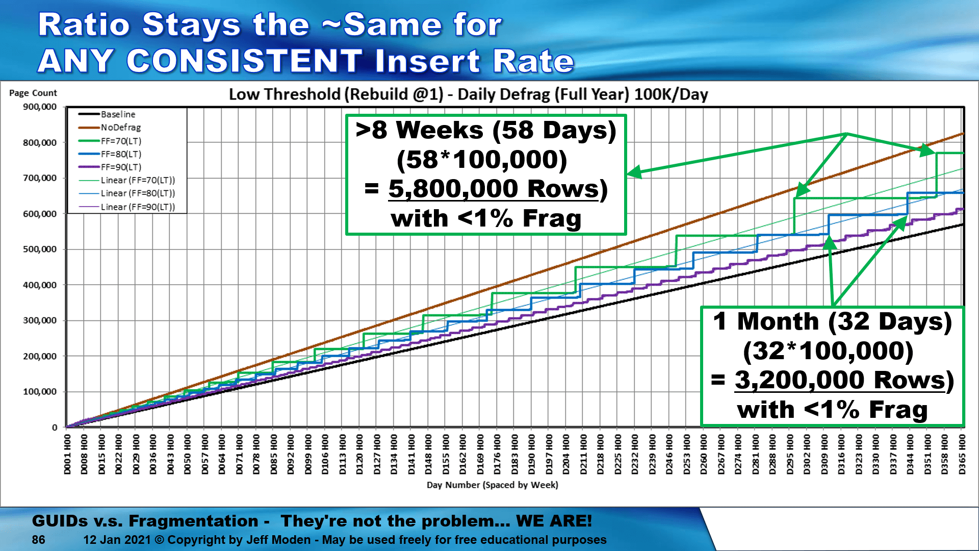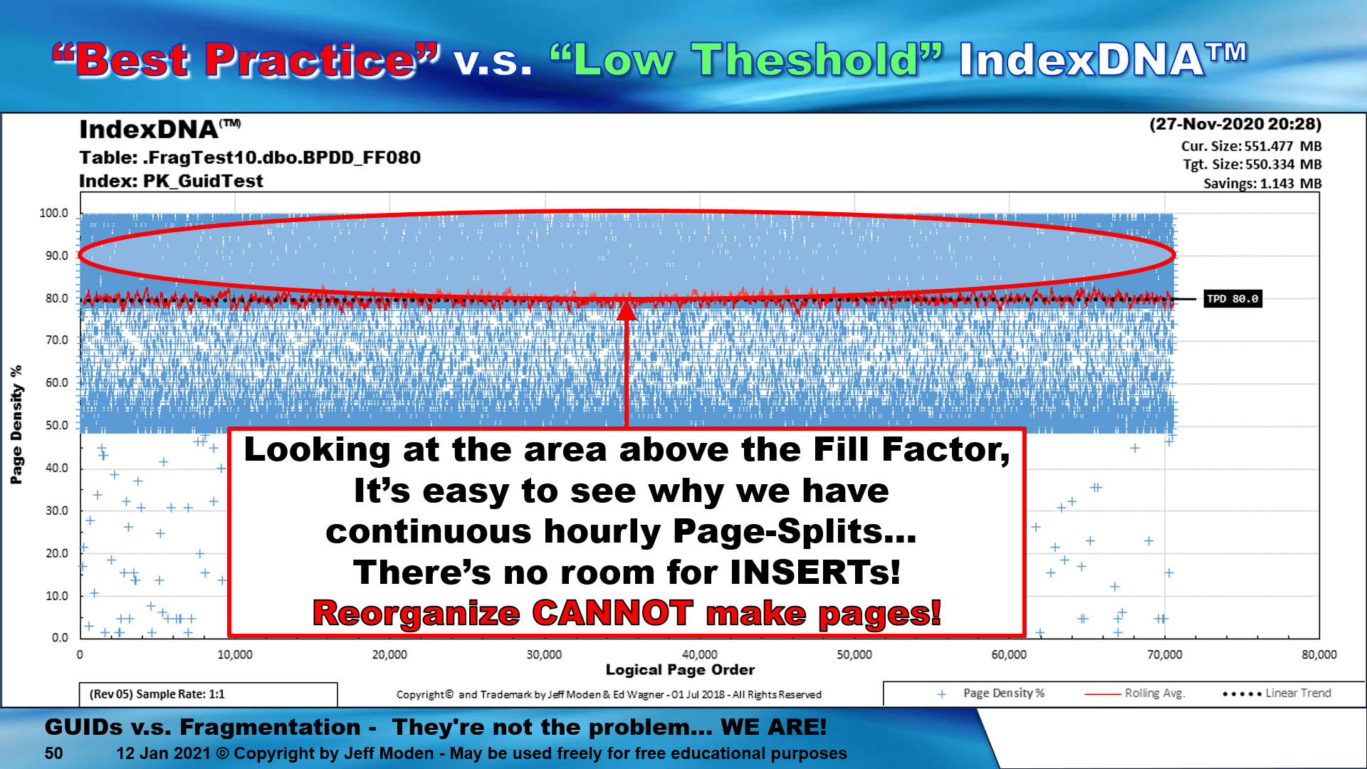 Just to give you a clue that I might just know what I'm talking about, I've done a shedload of testing with this kind of stuff. One of the tests I did inserts 100,000 rows per day in a 1005 RBAR fashion into a 123 byte/row Clustered Index for 58 straight days with < 1% fragmentation, almost zero page spits, and no index maintenance during the 58 day period. That's 5.8 MILLION random GUID rows inserted with < 1% fragmentation. The table contained ~29.8 Million 123 byte rows at the beginning of day 299, which was day 1 of the 58 day period I'm talking about. That was with a 70% Fill Factor and the other Fill Factors also work a treat.