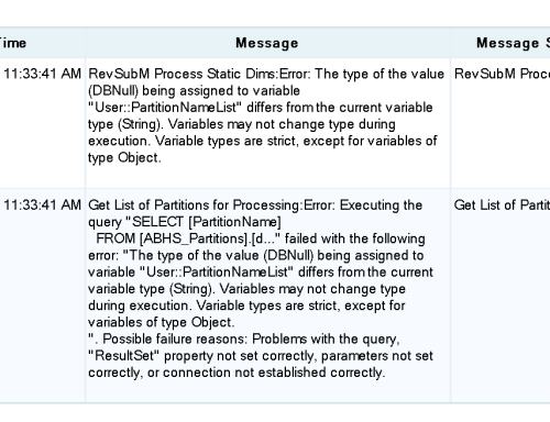 The issue now is a job that has three packages in it, first package ran fine backing up, truncing and loading in new dim values, ran fine, Then it rolled to the second package in the Solution where it failed. Below the screenshots I have more details.
